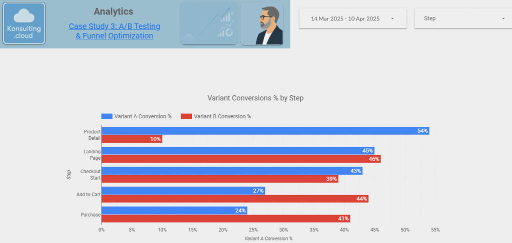 - Dashboard Build – Created a Looker Studio dashboard to monitor conversion rates, bounce rates, and test lift in real time.