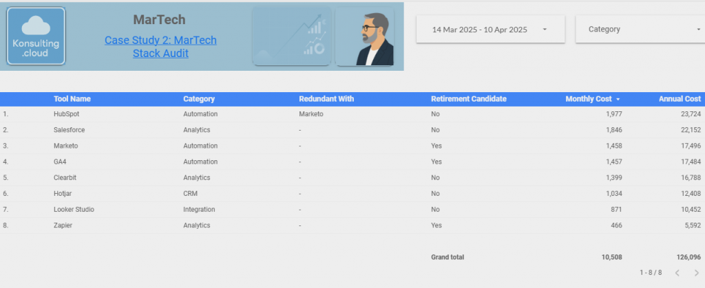 We conducted a full MarTech stack audit to evaluate tool usage, cost, integration, and strategic fit. The solution included: