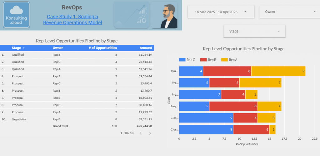- Reporting & Analytics Implementation – Built Looker Studio dashboards for revenue visibility, sales cycle tracking, and forecasting accuracy.