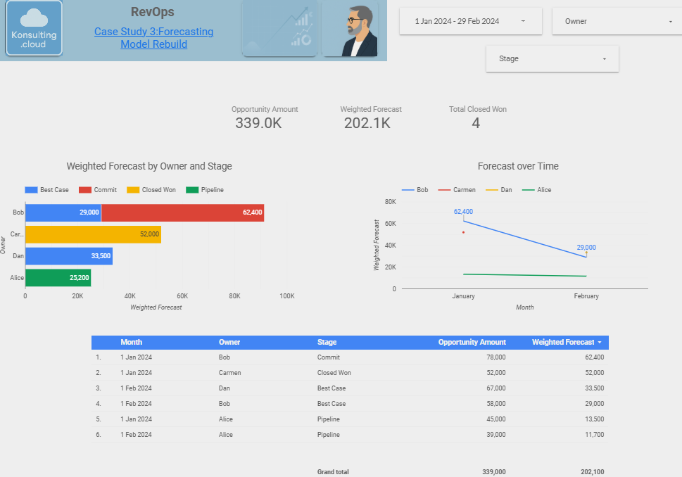 - Built a forecasting dashboard in Looker Studio with filters by team, owner, and forecast category